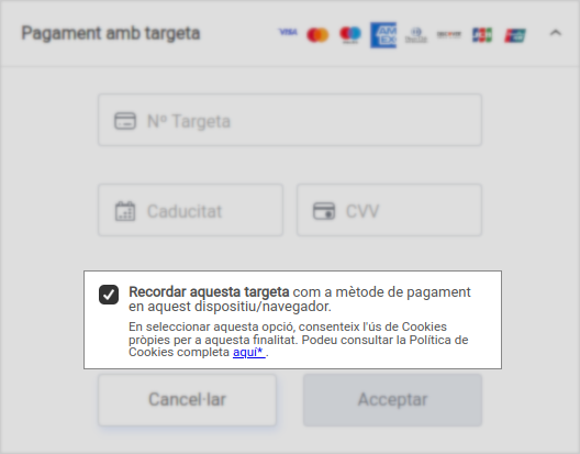 Per defecte, les comandes es paguen amb targeta de dèbit o crèdit, o Bizum. Per facilitar compres futures, a la pàgina de pagament del banc podràs seleccionar l’opció de recordar la targeta. Peix.cat no té accés a les targetes desades: