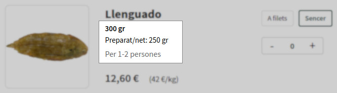 A la fitxa de cada producte trobareu el pes inicial i el pes final aproximat un cop net. A més, oferim una orientació sobre el nombre de persones que pot servir: